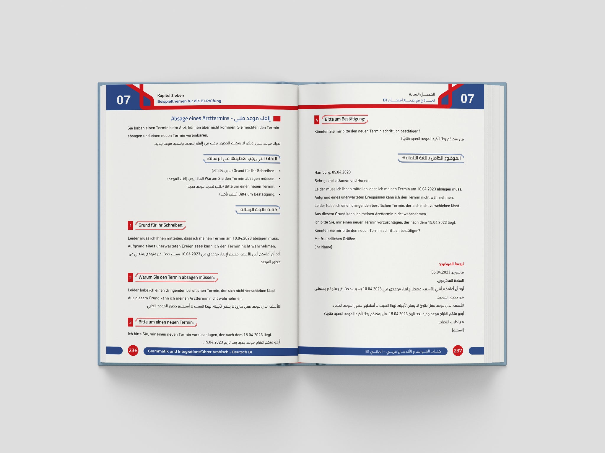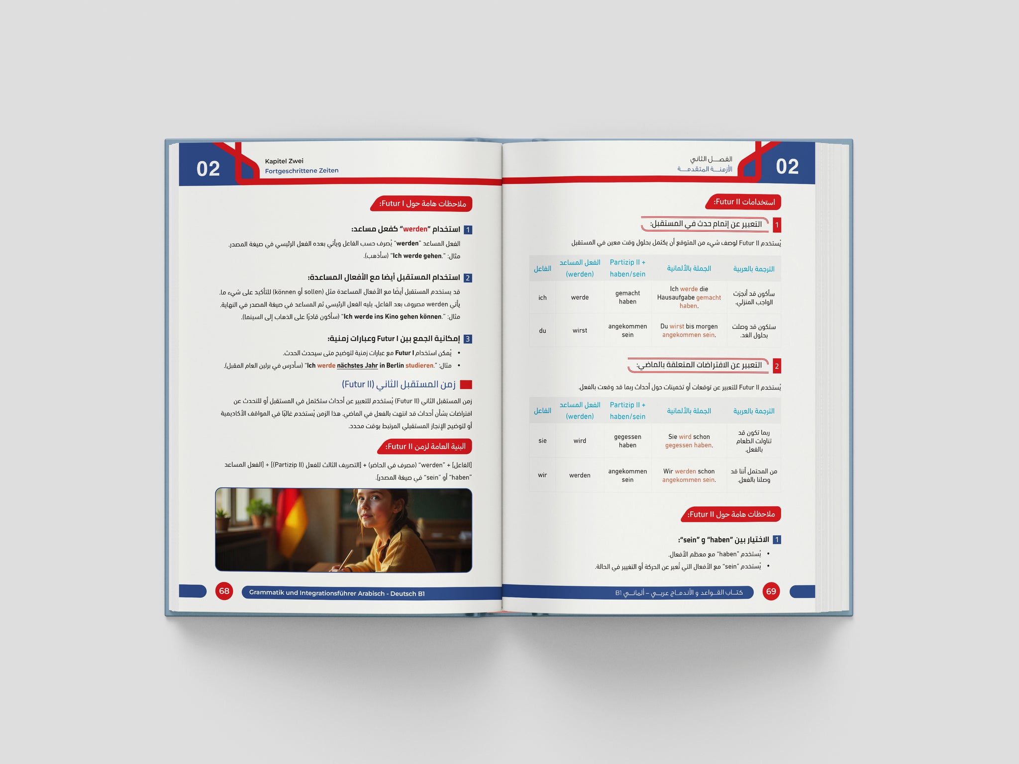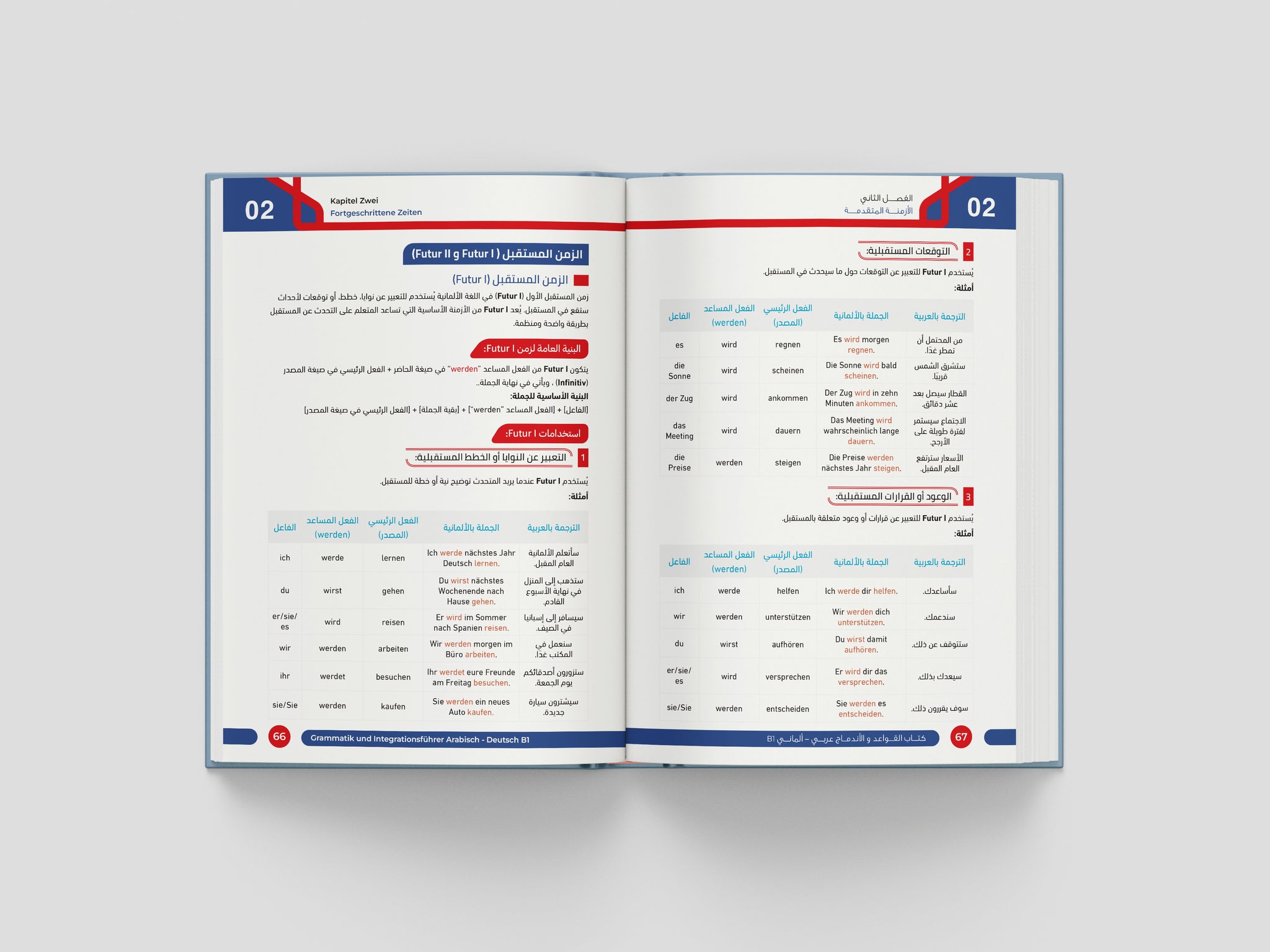 Der Grammatik- und Integrationsführer B1 bietet eine vollständige und verständliche Erklärung aller wichtigen Grammatikthemen des B1-Niveaus, klar strukturiert und leicht nachvollziehbar erklärt – mit besonderem Fokus auf typische Schwierigkeiten arabischer Lernender.